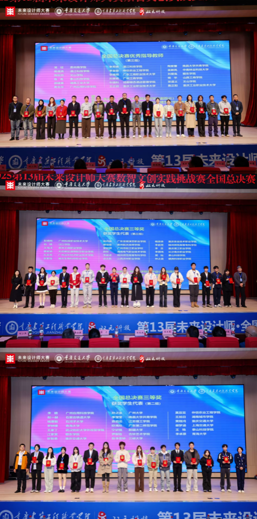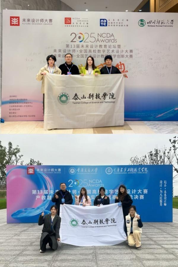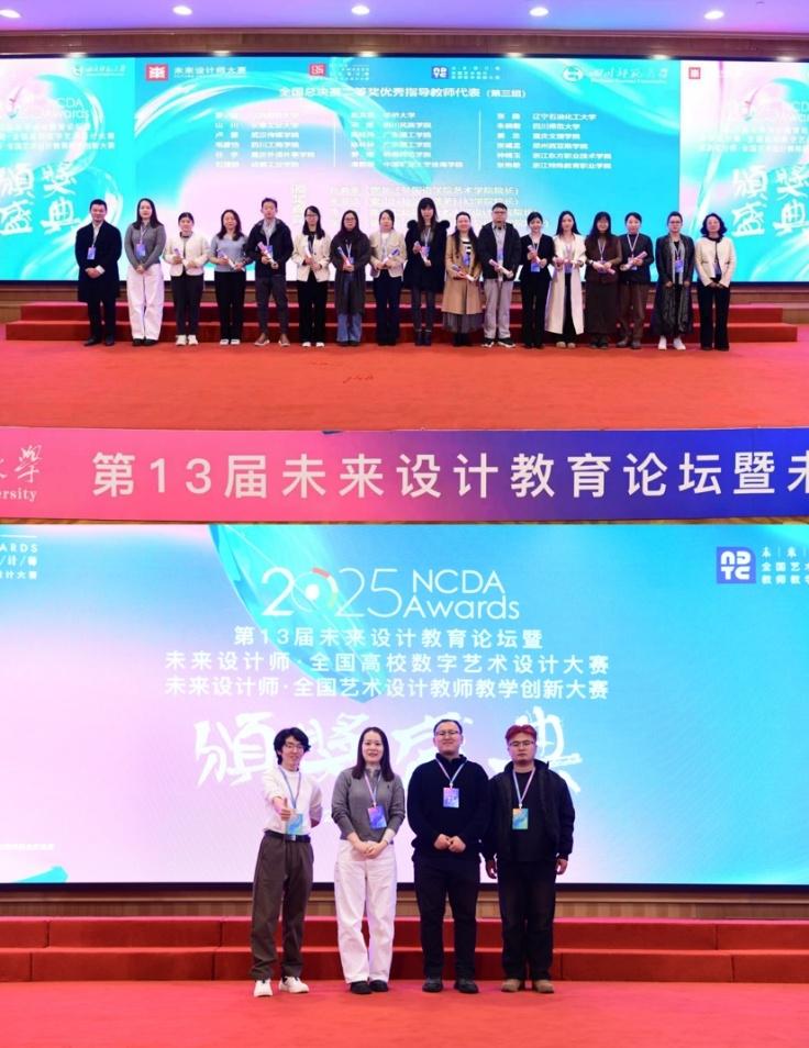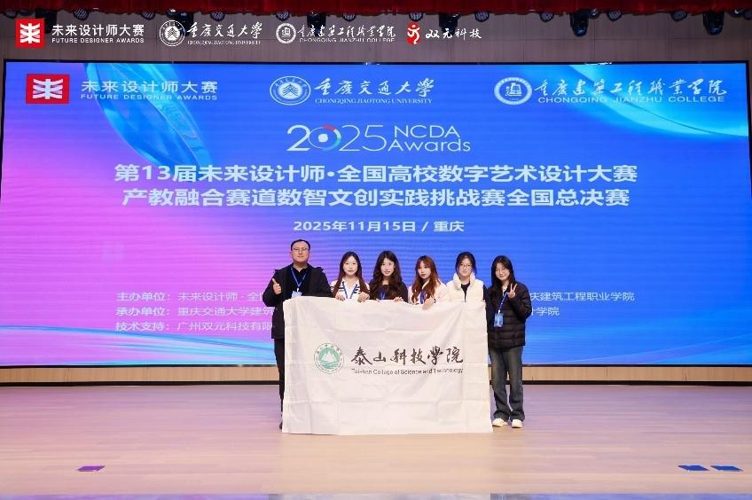 2025年11月,第13届未来设计师·全国高校数字艺术设计大赛全国总决赛于重庆建筑工程职业学院落幕,泰山科技学院蓬莱科幻学院两组学生代表团队在本次比赛产教融合赛道中荣获国赛三等奖佳绩,学院教师陈希获优秀指导教师。与此同时,第十三届未来设计师·全国艺术设计教师教学创新大赛暨未来设计教育论坛于成都举办,泰山科技学院荣获优秀组织单位奖,我校参赛教师陈希荣获国赛三等奖,学院副院长宋亚洁受邀出席论坛并担任颁奖嘉宾。