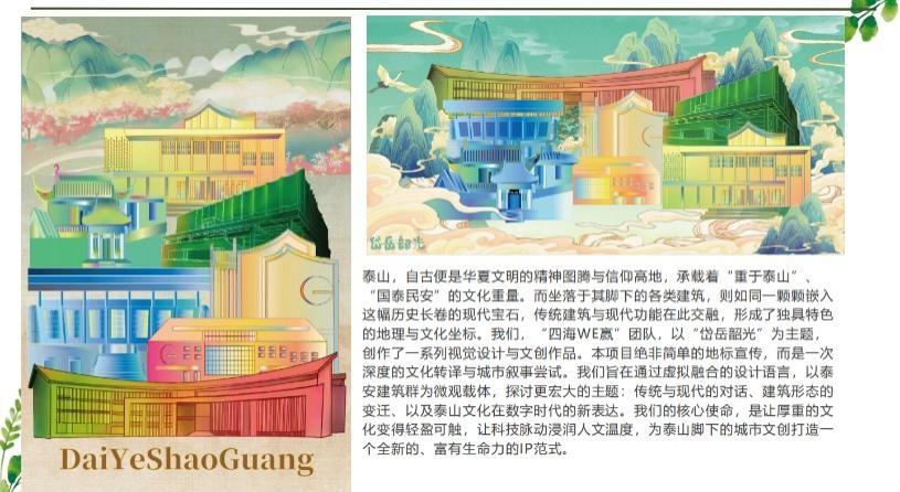 王艳、刘夏冰、闫程程学生团队制作的“岱岳韶光”AR文创设计,以泰山文化为根基,通过AR与AI大模型的深度融合,让泰山校园的特色建筑在虚拟场景中立体呈现,用户触碰即可解锁历史故事,实现了文化与科技的温柔对话。