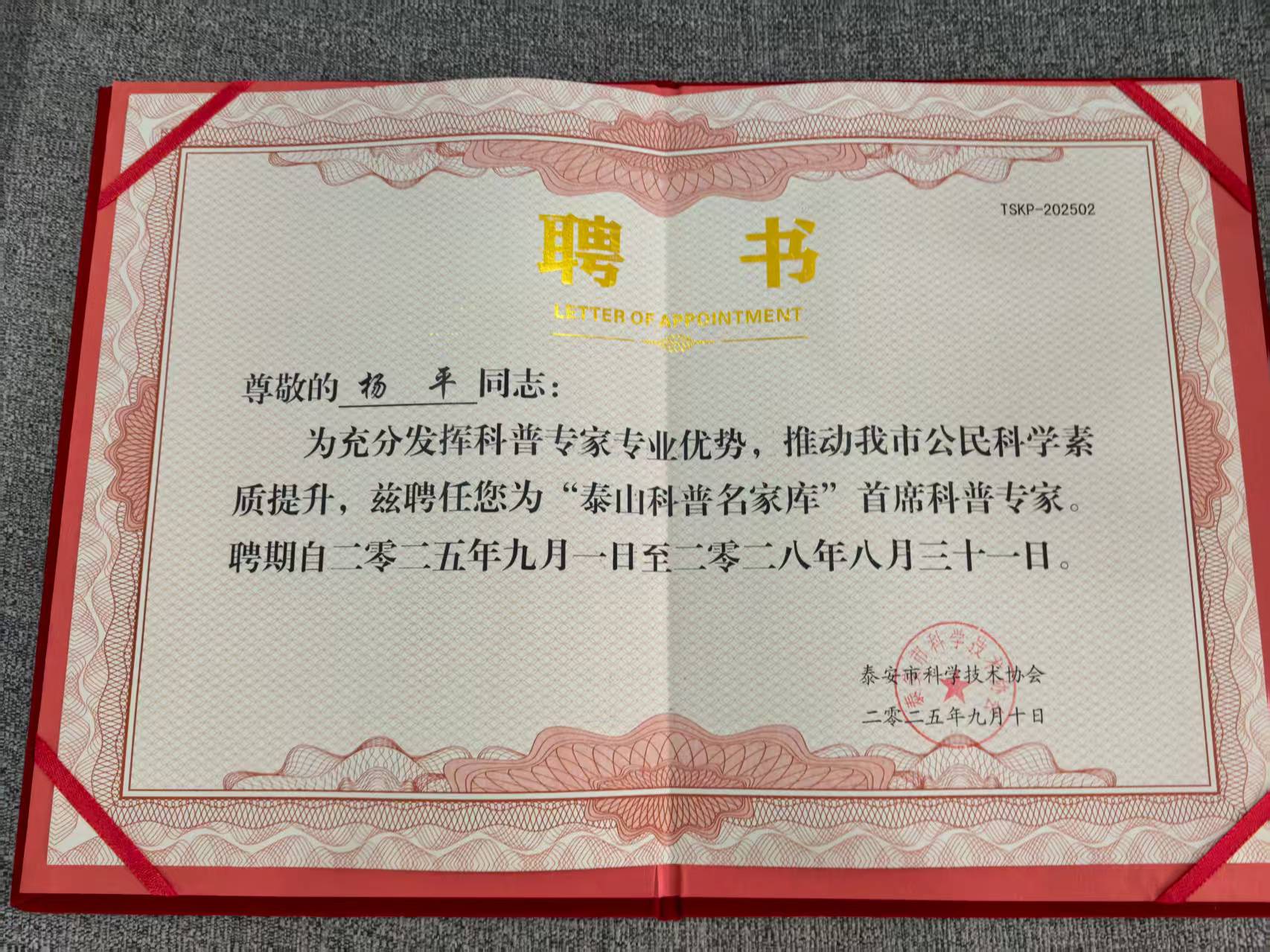 9月11日上午,2025年“全国科普月”泰安市主场活动暨泰山区“科学进社区·科普惠万家”活动启动仪式在泰山区北上高社区举行。泰山科技学院教师杨平获聘成为“泰山科普名家库”首席科普专家。
