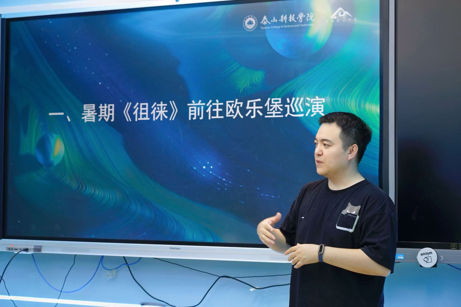 会议伊始,学院教师代表对暑期外出巡演、赛事获奖经验进行分享交流。薛瀛老师分享与总结暑期带领学生前往齐河泉城欧乐堡主题公园,出演学院原创红色实景剧本杀《徂徕》的心得。同学们用自信饱满的状态和无比热情的表演,让从未接触过剧本杀的主题公园领导和工作人员体验了《徂徕》的魅力。此次欧乐堡主题公园之旅,不仅是一次成功的艺术实践,也是革命精神在剧本杀形式下焕发新生的尝试。