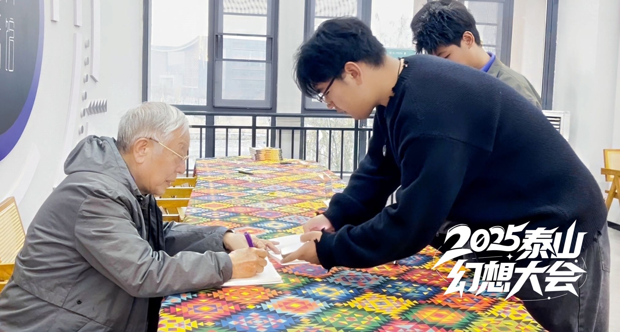 在无用楼云海展厅,刘慈欣、王晋康等著名科幻作家进行雅集签赠仪式,等候已久的师生们手捧经典著作有序排队,现场氛围热烈而温馨,两位作家耐心为每位读者签名题字,每一份签赠都成为连接科幻大师与爱好者的精神纽带,让科幻的种子在面对面的交流中生根发芽。