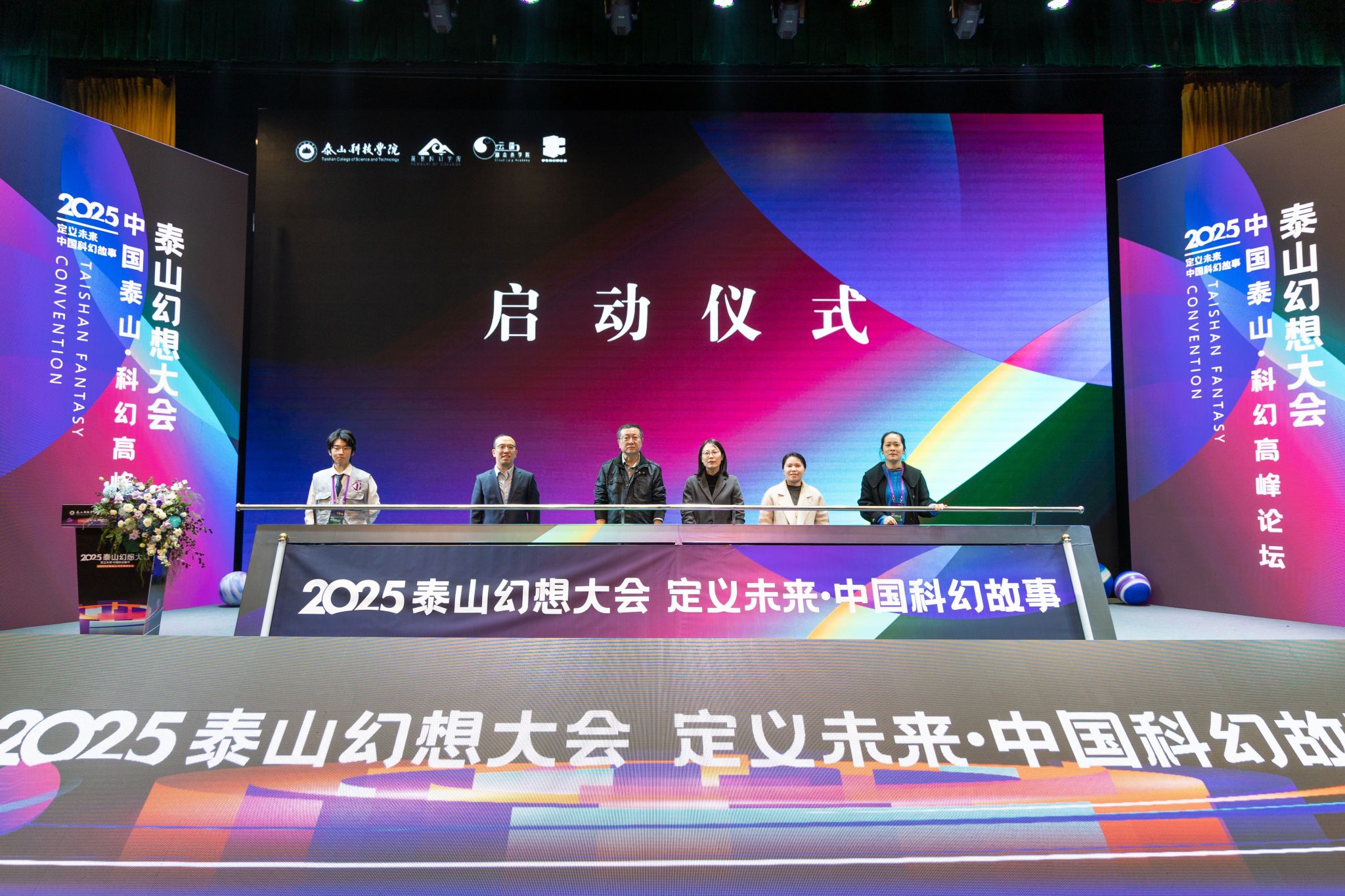 启动仪式上,著名科幻作家、雨果奖与克拉克想象力服务社会奖双料得主刘慈欣;泰山科技学院常务副校长谢承红;重庆移通学院通识教育学院执行院长皮若兰;泰安市科协四级调研员陈金辉;蓬莱科幻学院(云端剧本杀学院)副院长宋亚洁;以及学生科幻联合会主席田泽斐共同启动本次科幻大会,一场聚焦中国科幻未来的深度对话就此启航!
