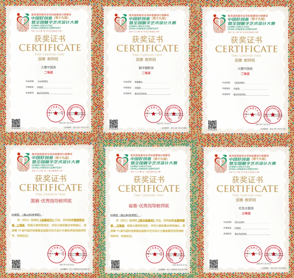 本年度学院师生屡获佳绩,在第 13 届未来设计师·全国高校数字艺术设计大赛全国总决赛,学院两组学生团队获国赛三等奖,教师陈希获优秀指导教师。在未来设计师·全国艺术设计教师教学创新大赛,学院获优秀组织单位奖,陈希老师获国赛三等奖。在第19届中国好创意暨全国数字艺术设计大赛中,学院多位学生斩获18项国家级、省级奖项;学院教师孙继凯、王玉琨老师获优秀指导教师;学院教师孙继凯获多项教师组国家级奖项。学院学生同时获得第六届“泰山杯”招生广告创意大赛一等奖、第四届“无用杯”通识素养大赛一等奖、三等奖等多项荣誉。