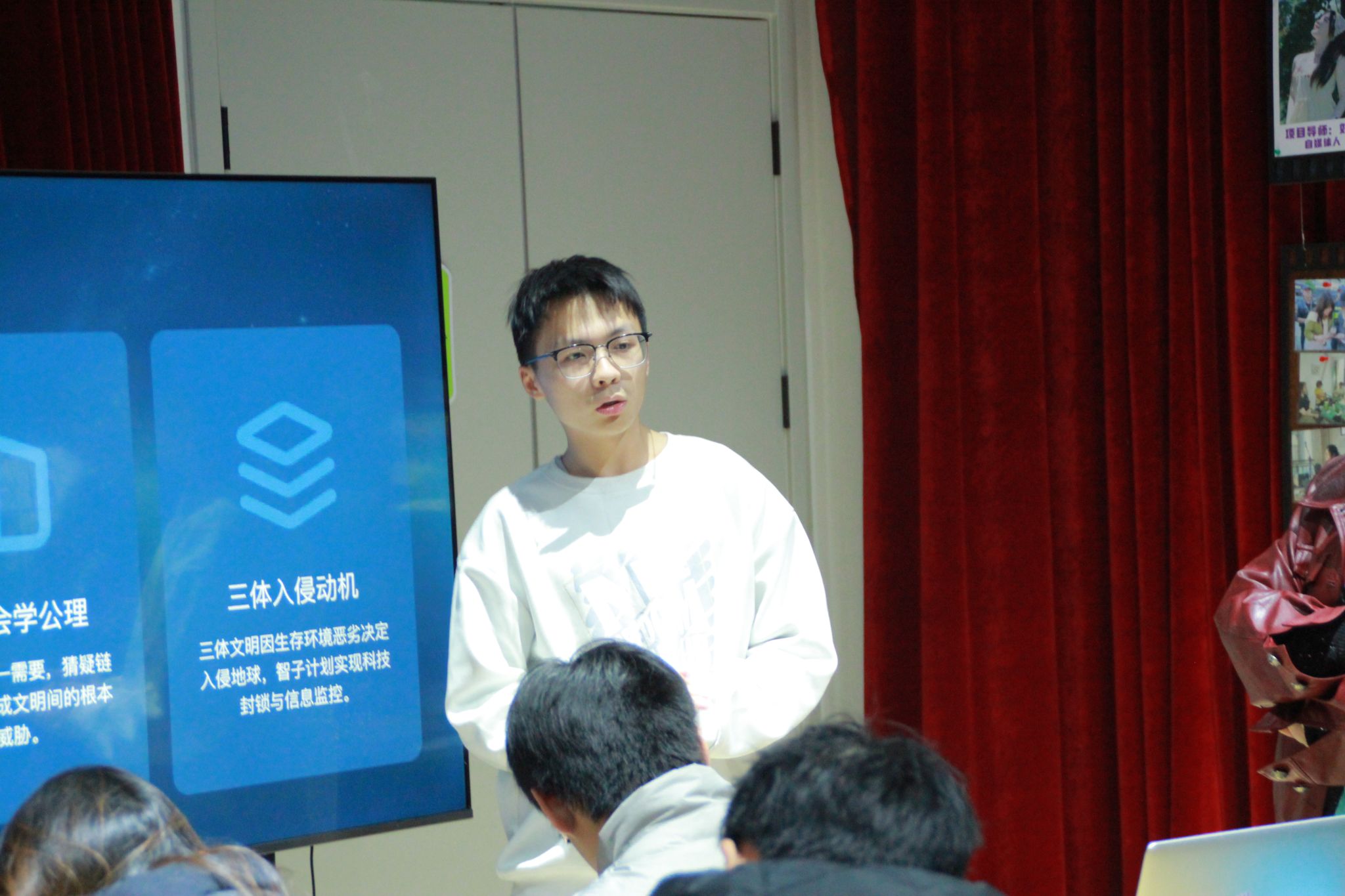 活动开始,主讲人王玉琨老师向同学们简单介绍了三体的世界观,讲述了地球文明与三体文明跨越四光年的博弈史诗,通过视频大家直观的感受到了全人类希望与绝望。其中叶文洁这一角色作为地球与三体文明连接的关键人物,她的挣扎与抉择成为师生热议的焦点。王老师特别提到,叶文洁在经历人性的背叛与苦难后,按下发射键的瞬间,既是对人类文明的失望,也是对宇宙未知的孤注一掷,这个充满争议的角色,恰恰撕开了人性的复杂切面——没有绝对的善恶,只有在绝境中被放大的执念与迷茫。
