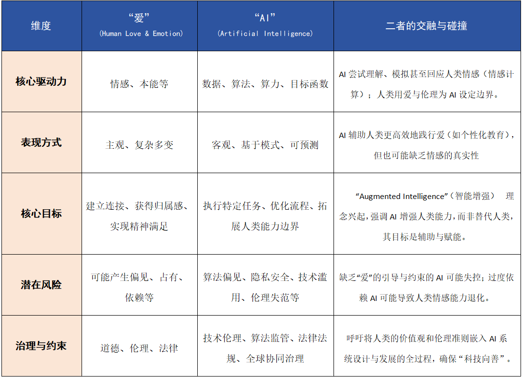 二者的根本差异在于:爱是主体间的情感实践,依赖生物性与社会性的交织,具有不可量化的主观体验;AI则是客体化的计算过程,其能力边界受限于训练数据分布与目标函数设计。但二者在当代产生深刻交互:AI技术正尝试模拟爱的外在表达(如情感计算、陪护机器人),而爱的伦理观(如不伤害、尊重自主性)也开始反哺AI治理,推动技术发展保持人性化方向。这种动态关系揭示了一个核心命题:当AI试图逼近爱的表象时,人类更需通过爱的本质来约束AI,确保技术始终服务于人的繁荣而非异化人的价值。