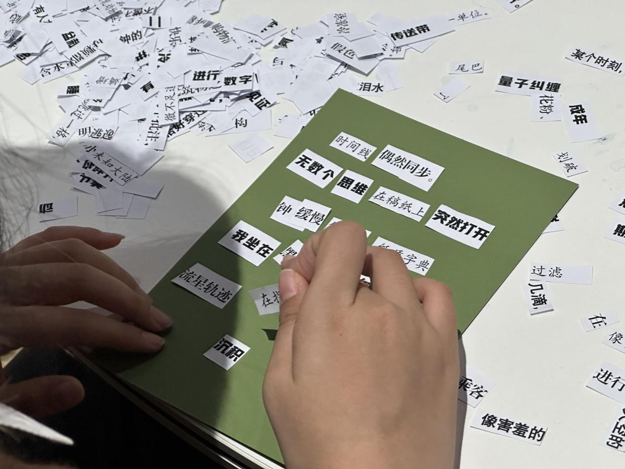 随后,各小组通过抽签获得各自的电影画面及一组随机词汇卡片。这些“碎片字符粒”包括名词、动词、形容词及抽象概念,如“一个”、“黑夜”、“咖啡机”、“褪色的证件”、“液态的记忆”、“交叉的时区”等。