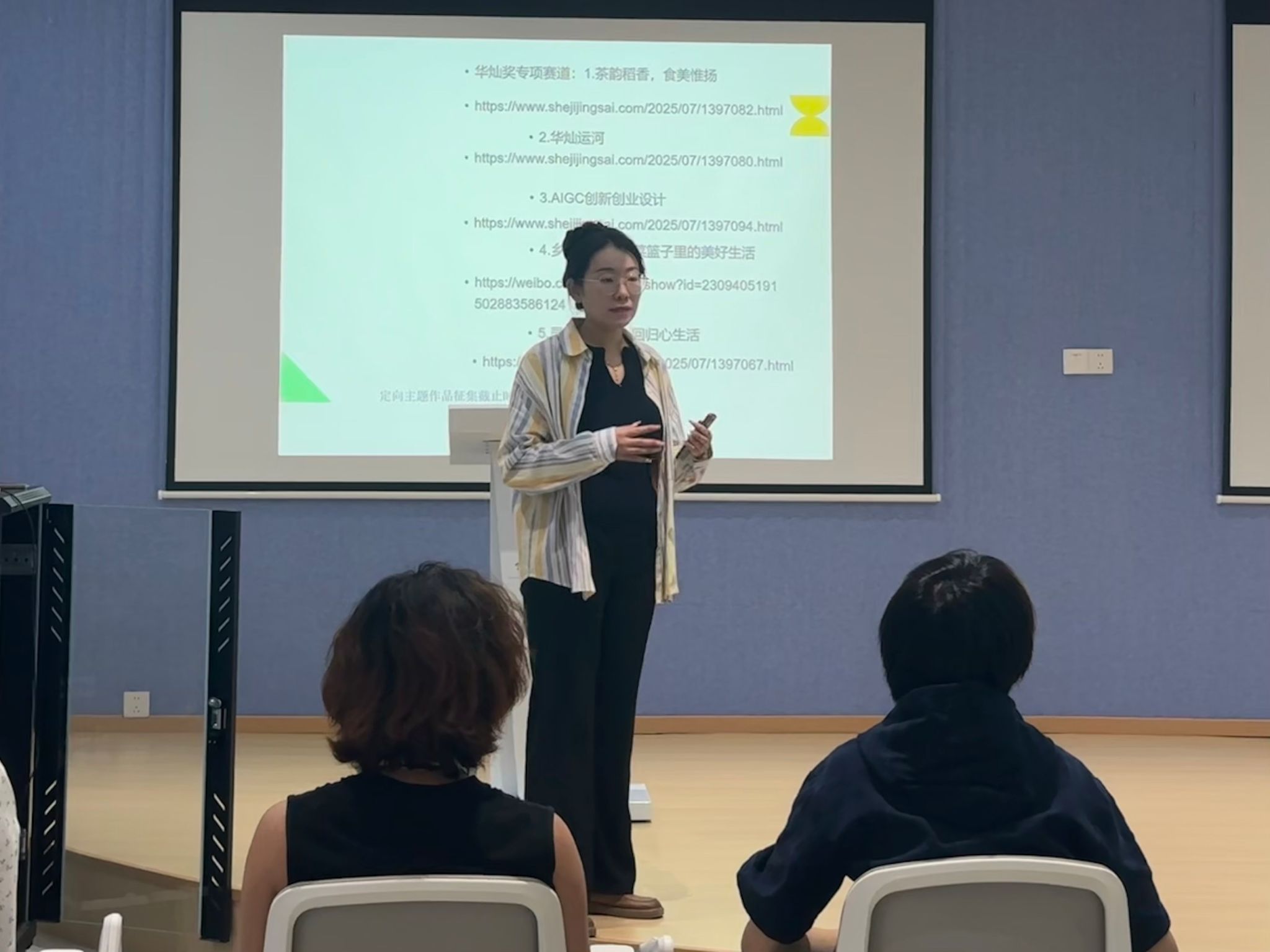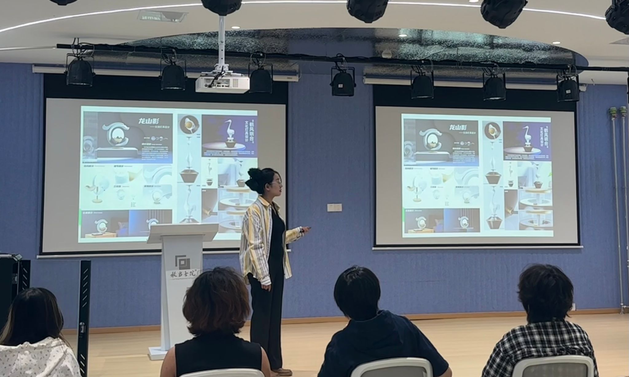 随后,彭悦老师详细讲解相关赛事信息,重点介绍两岸新锐设计竞赛“华灿奖”,涵盖茶韵稻香、华灿运河等五大专项赛道,并明确定向主题作品征集截止时间,鼓励同学们积极参与,以赛促学。除此之外,现场还展示“鹤风明台”文化灯具设计、“轱辘钱”多功能灯具等优秀文创作品,让同学们直观感受文创产品设计魅力。