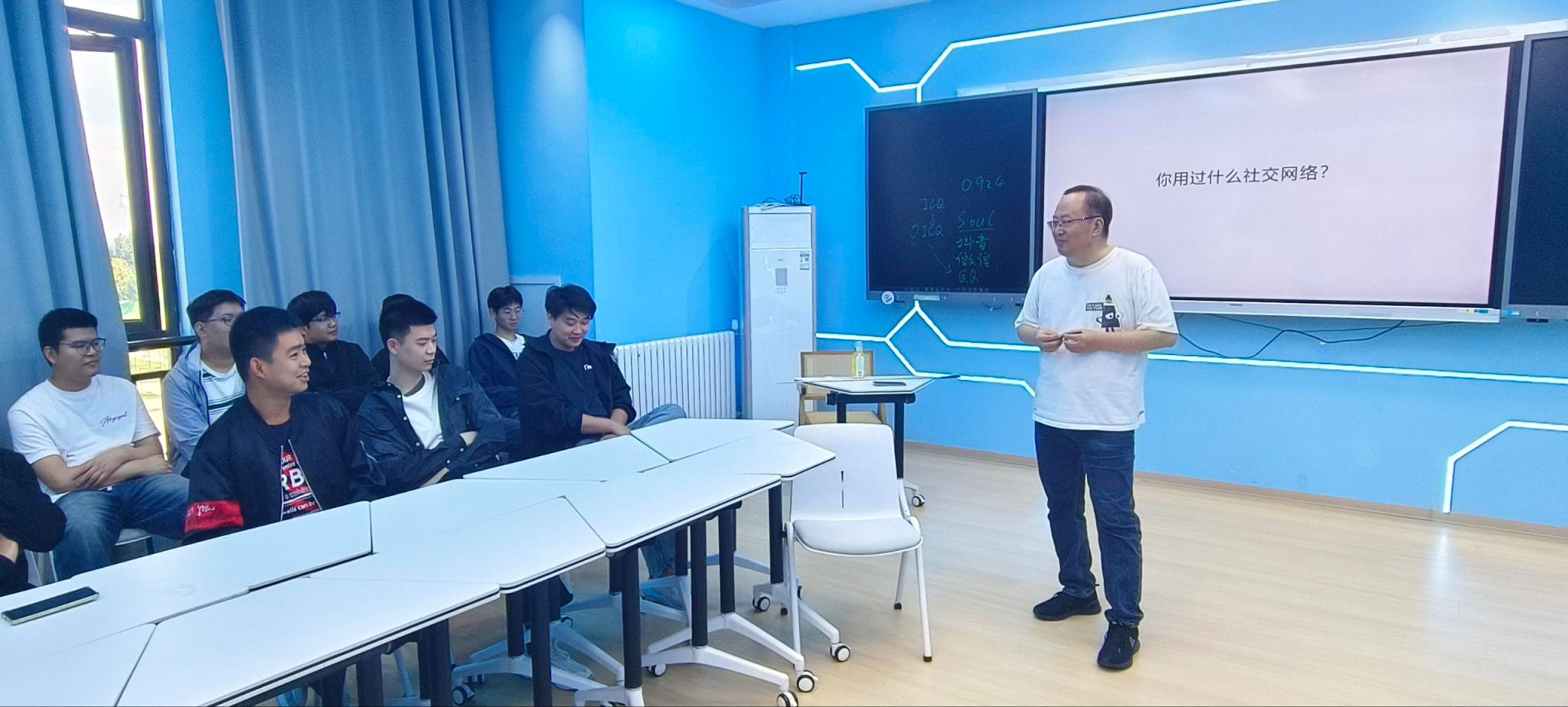 一开始,杨平老师就问同学们都用过哪些社交网络。同学纷纷提出微信、QQ等。杨平老师接着问,你们还能离开这些社交网络吗?同学们表示很困难,如果停止使用,很多朋友都无法联系,甚至正常生活学习都会受到影响。那么,一款社交网络到底该有哪些特性?同学提出了快捷、方便、实时性、互动性、安全性等特性。