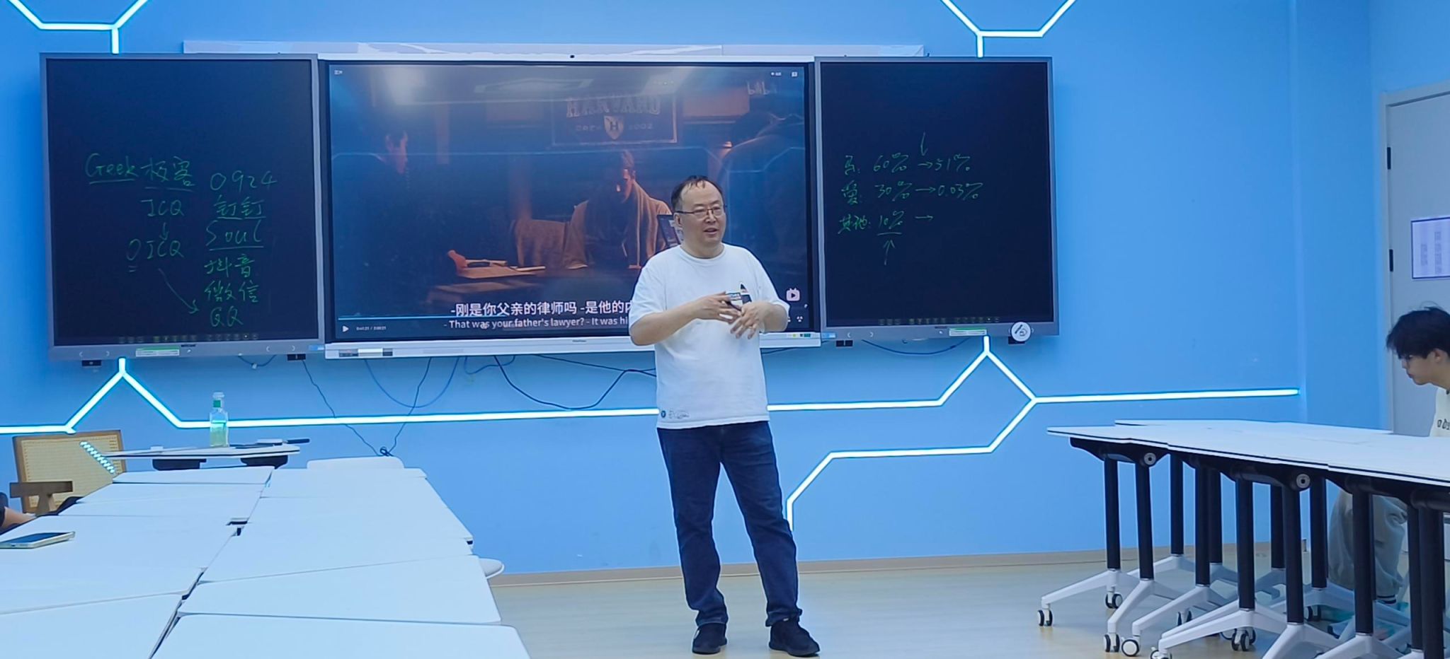 王凯新同学说道:“通过这节课让我更加清楚的了解到我们所依赖的社交软件最初的雏形,以及它是如何发展和成型的,再通过老师的讲述和里面主人公的性格让我学到要自信,更要大胆想到其他人想象不到的东西。”