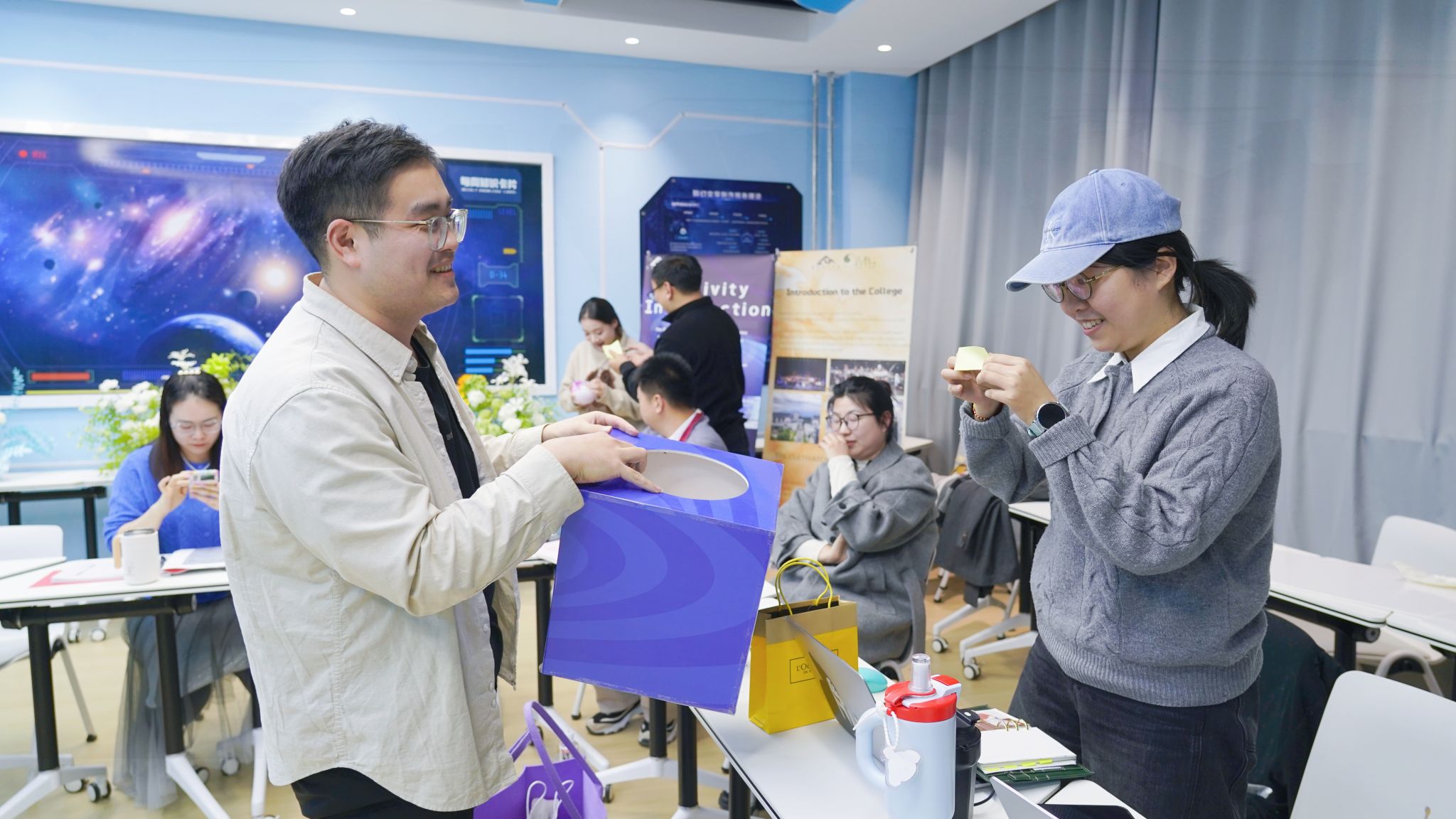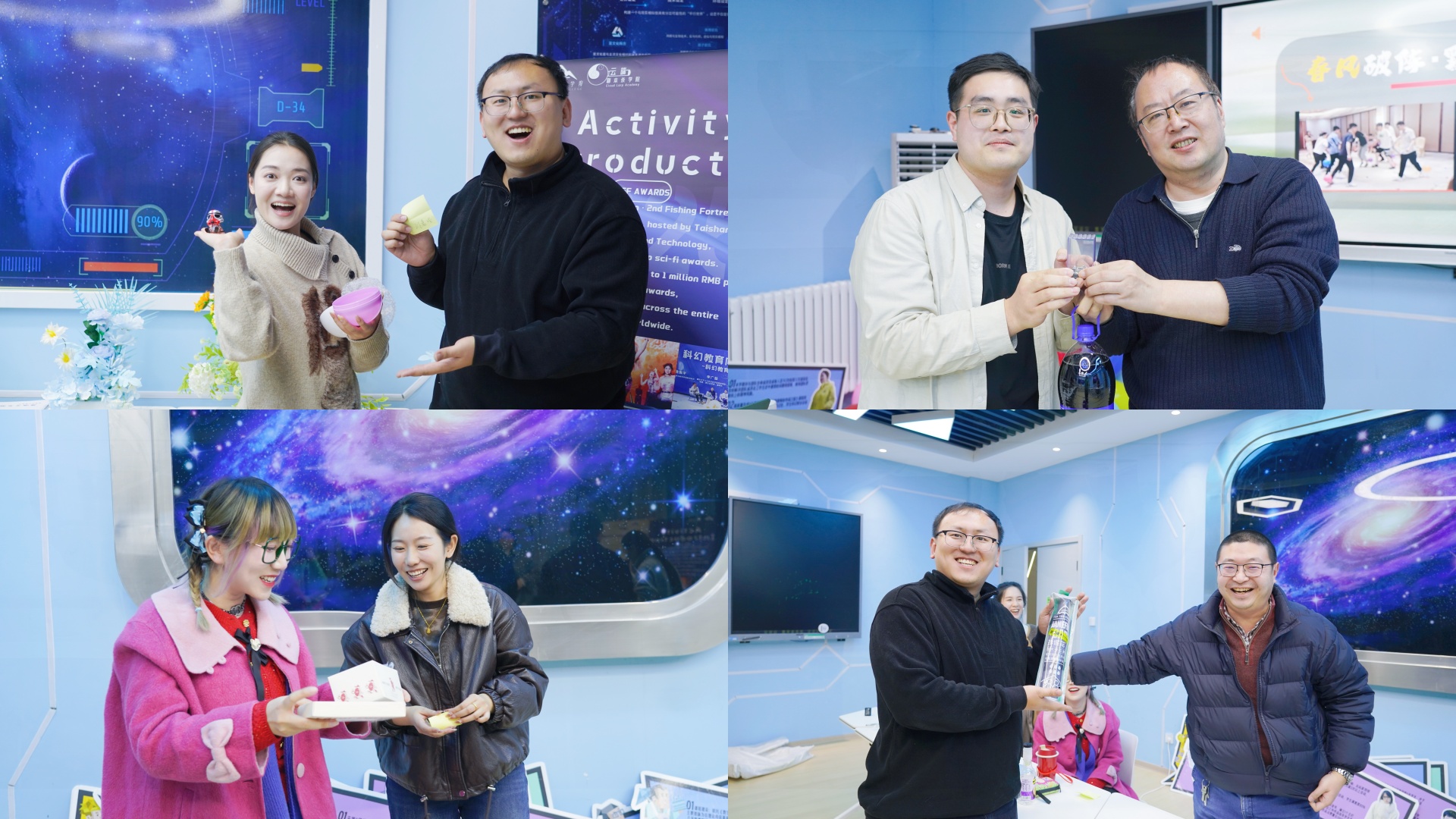 会议第三阶段的帷幕缓缓拉开,在干货满满的工作汇报告一段落后,会议正式切换至轻松温馨的团队互动模式。老师们化身“心意投递员”,将提前精心筹备的礼物悉数呈上,通过抽签的方式解锁专属惊喜联结。每一份礼物都是一次温暖的“时空投递”,背后承载着同事间的默契祝福与并肩同行的珍贵回忆。现场欢笑声此起彼伏,团队的凝聚力与归属感在这场暖心互动中悄然升温、愈发浓厚。