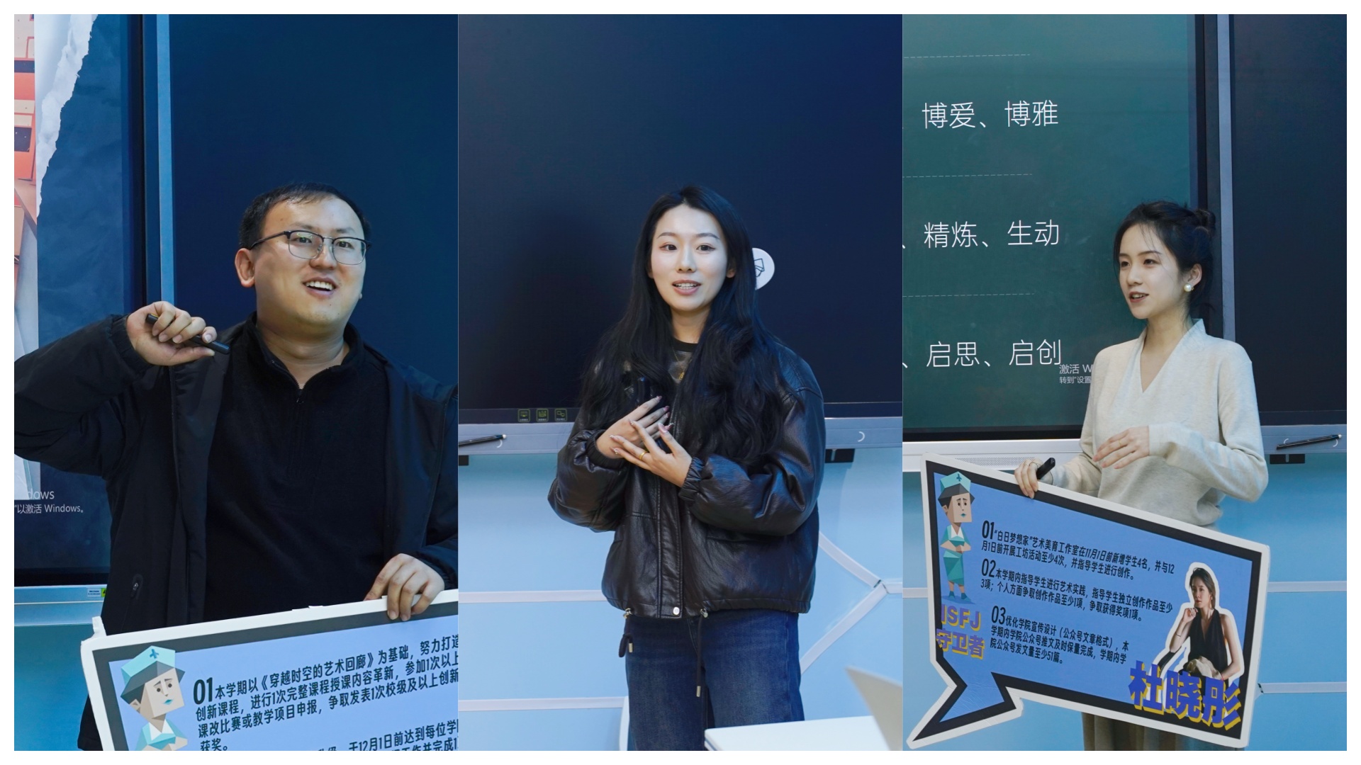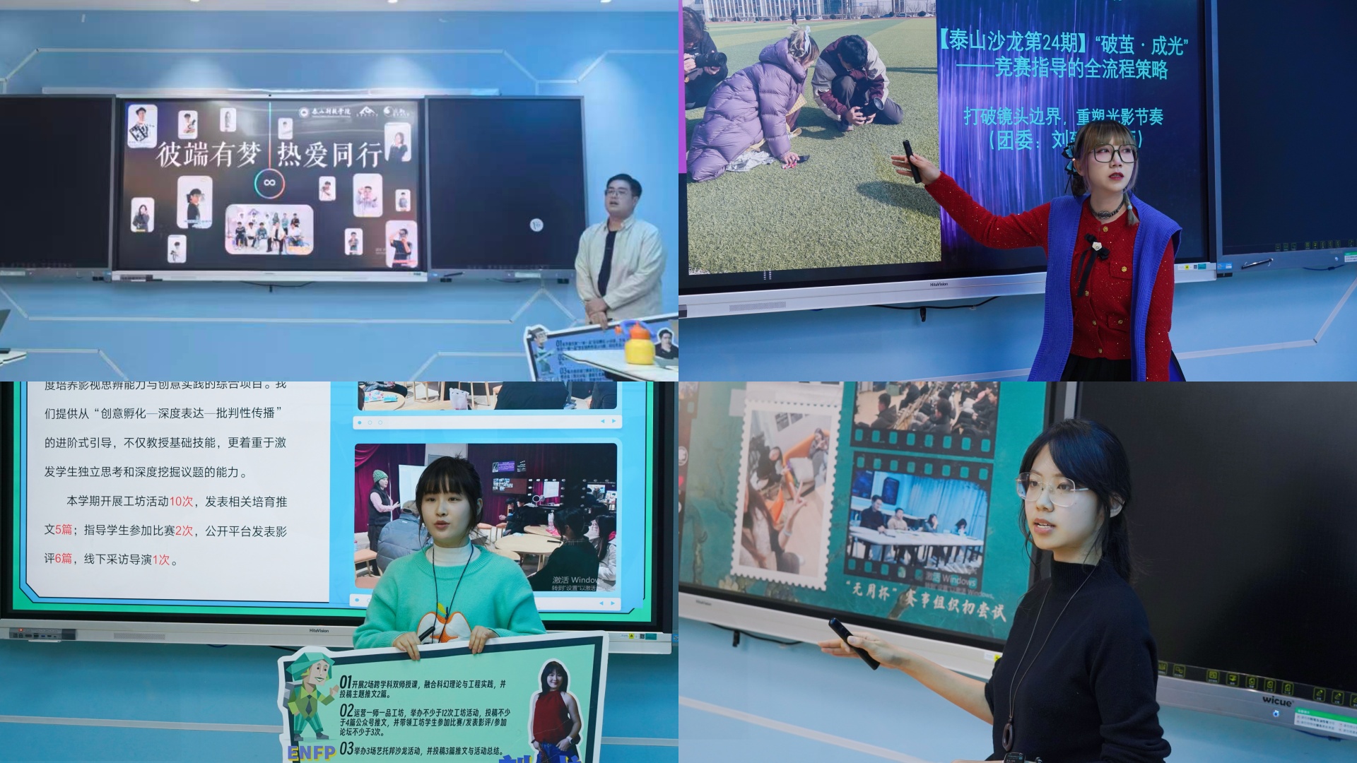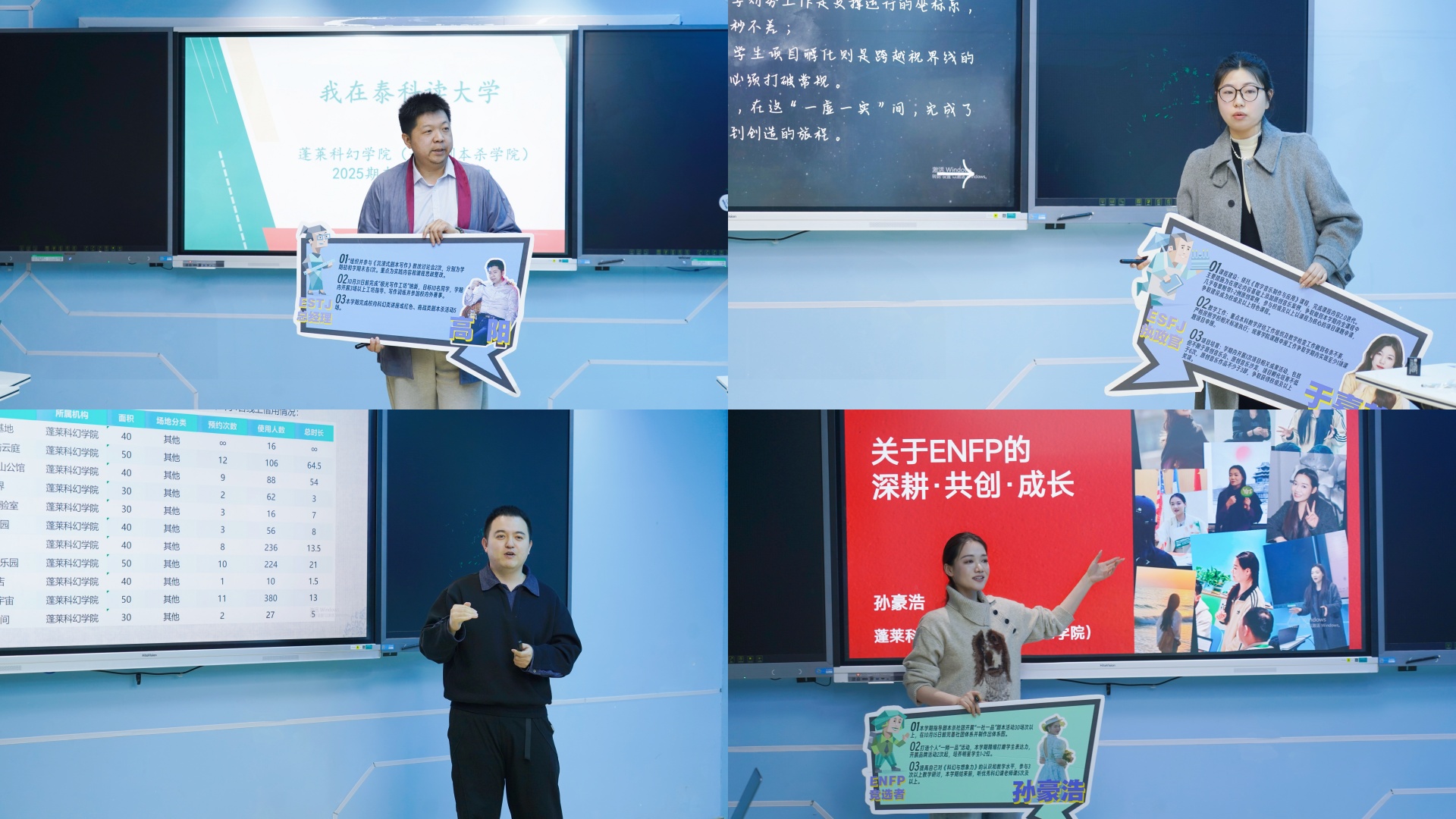 演绎组注重品牌建设与学生培育:组长高阳老师以“在泰科读大学”的独特视角,梳理学院品牌活动与工坊建设成果;于嘉荣老师从“坐标系之下”的行政基础工作,转向“视界线之上”的项目音乐美育,分享学院工作与育人过程的相关经验;薛瀛老师围绕空间升级、勤工团队建设与个人剧本创作等方面展开具体分享;孙豪浩老师以ENFP的共创热情,分享剧本杀课程开发、社团活动育人及大型项目执行保障等方面的积极探索。
