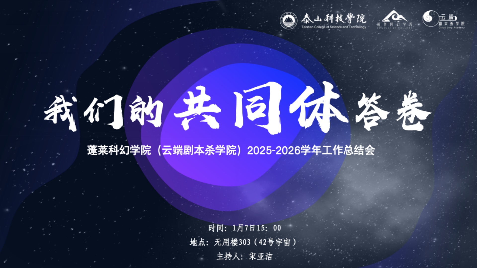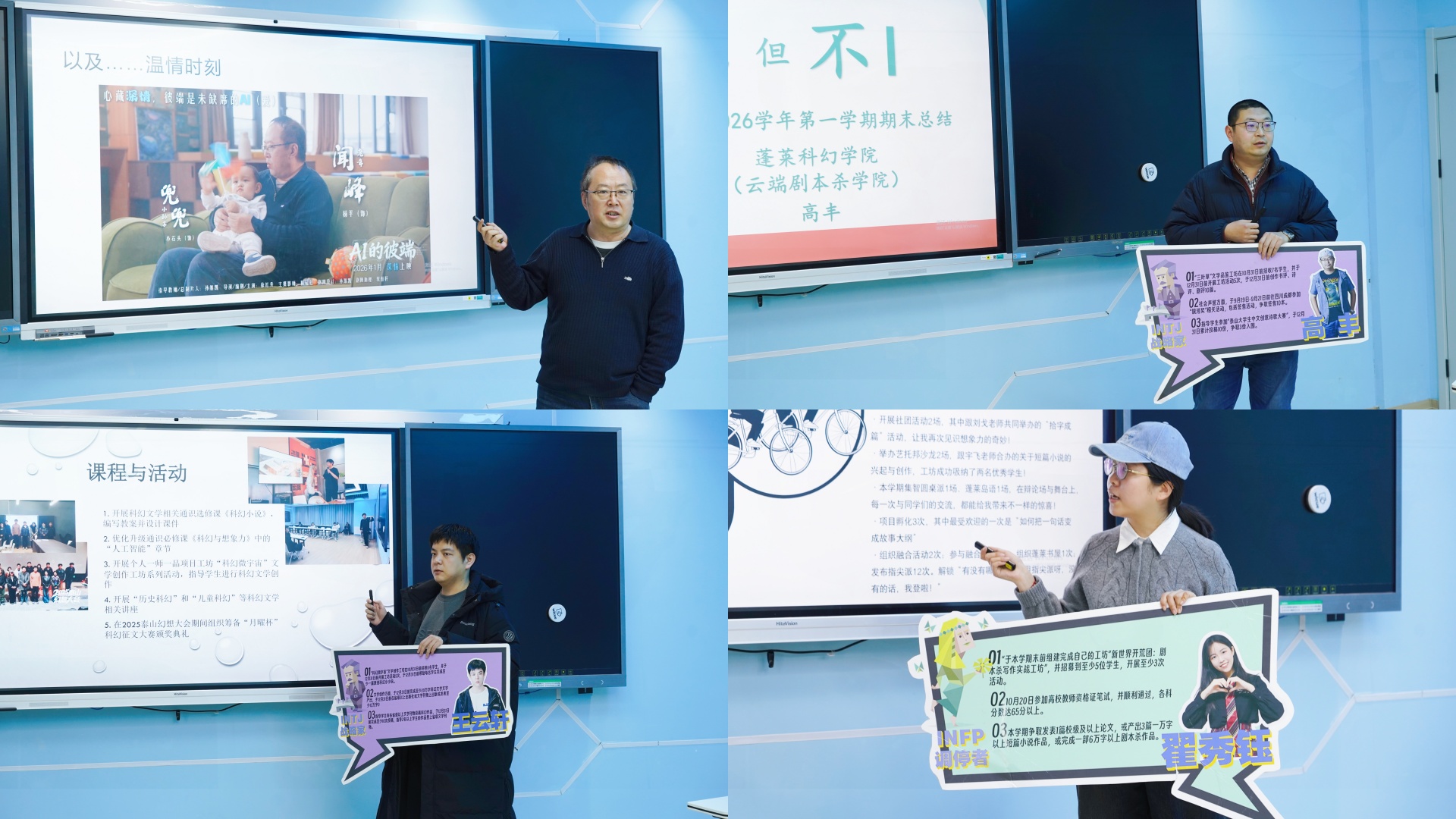 1月7日下午3点,蓬莱科幻学院(云端剧本杀学院)在无用楼303(42号宇宙特色空间)召开2025-2026学年工作总结会。会议由学院副院长宋亚洁主持,全体教师以“性格标签+工作成果+温情瞬间”的形式依次进行学期工作总结汇报,生动展现了一学期以来的成长轨迹与教学育人沉淀。